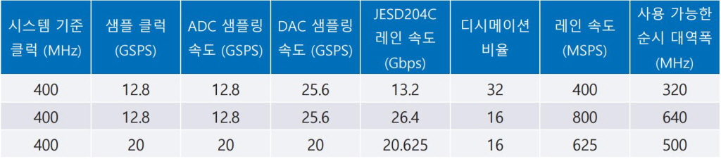표 1은 400MHz 기준 클럭으로 구동되는 쿼드-아폴로 MxFE 시스템의 대표적인 세 가지 동작 설정을 요약한 것이다.