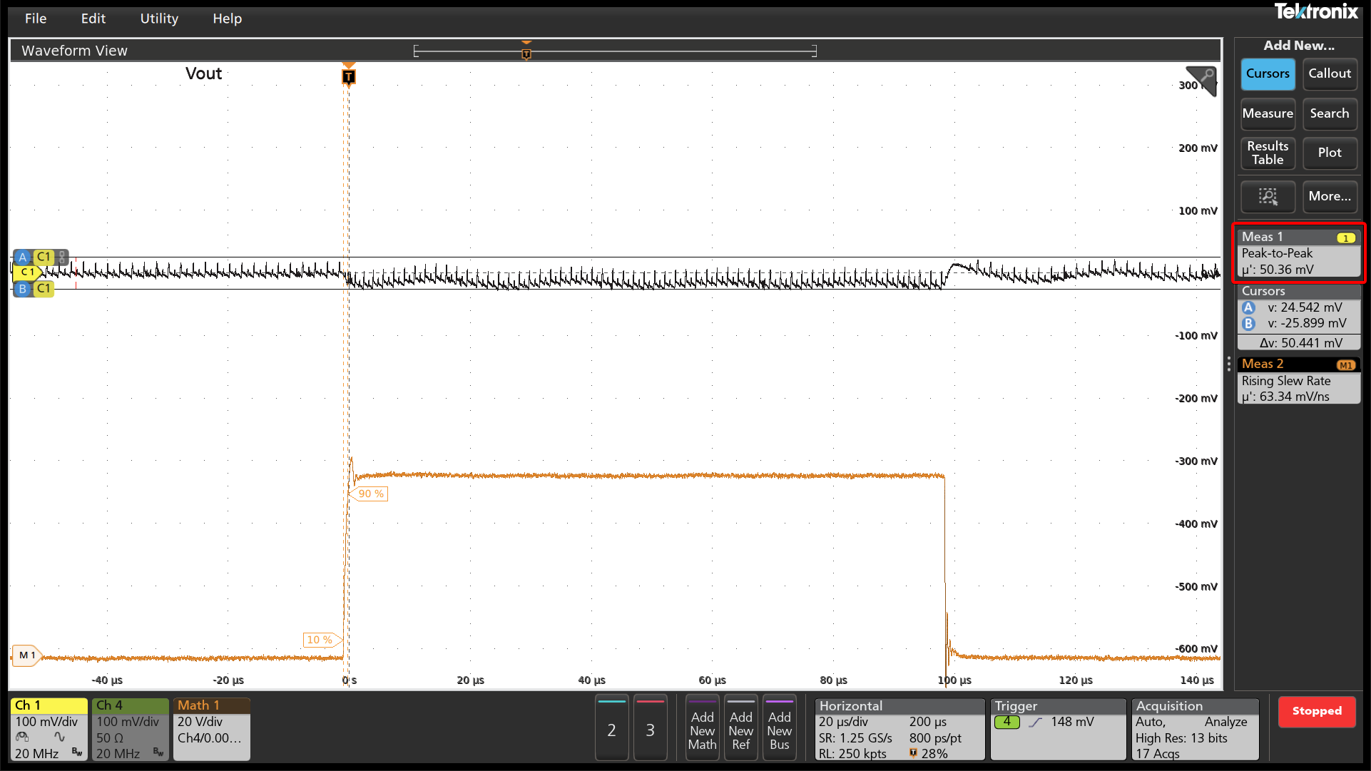 ▲그림4 : 과도 응답 테스트 결과(1 모듈, 2상, 부하 과도 응답 범위: 0A→60A, 피크-투-피크 전압 허용 오차 ±30mV 이내)