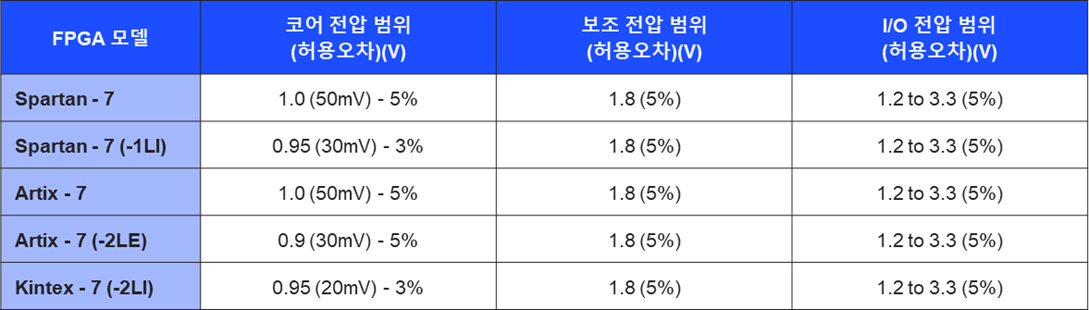 앞서 제시된 두 표([표1]과 [표2])에서 확인할 수 있듯이 FPGA의 전압 규정은 매우 엄격하다.