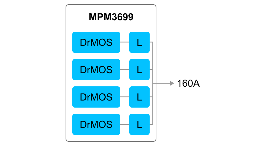 MPM3699는 4개의 DrMOS 모듈을 내부에 통합하여 설계되었으며, 이를 통해 최대 160A의 출력 전류(IOUT)를 생성할 수 있다. [그림3]은 이러한 MPM3699의 내부 구성을 보여준다.