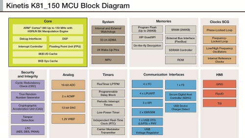 안전한 임베디드 애플리케이션을 만들 때 이전에는 주 프로세서, 암호화 기능을 수행하기 위한 보안 역할의 보조 프로세서, 그리고 경우에 따라 물리적 변조 방지를 위한 IC 등 최대 3개의 IC가 필요했다. 새로 출시된 키네티스(Kinetis) K8x MCU 제품군은 비용, 크기 및 전력 소비 절감을 위해 이들 기능을 모두 단일 MCU에서 수행한다. 프리스케일은 이 일반 공급용 MCU 제품군에 뛰어난 보안 기능을 구현하여 POS 장비, 스마트 에너지 게이트웨이, 홈 오토메이션 및 건물 제어, 휴대용 의료 디바이스 및 웨어러블 장치 등의 IoT(사물간 인터넷) 애플리케이션에 안전한 연결 기능을 제공하고 있다.
