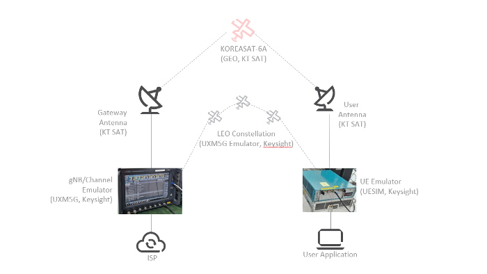 시연은 KT SAT 금산위성센터에서 진행됐으며, 키사이트의 UXM 5G 무선 테스트 플랫폼(기지국 에뮬레이터)과 UeSIM(단말 에뮬레이터)이 각각 기지국과 단말 역할을 수행했다.