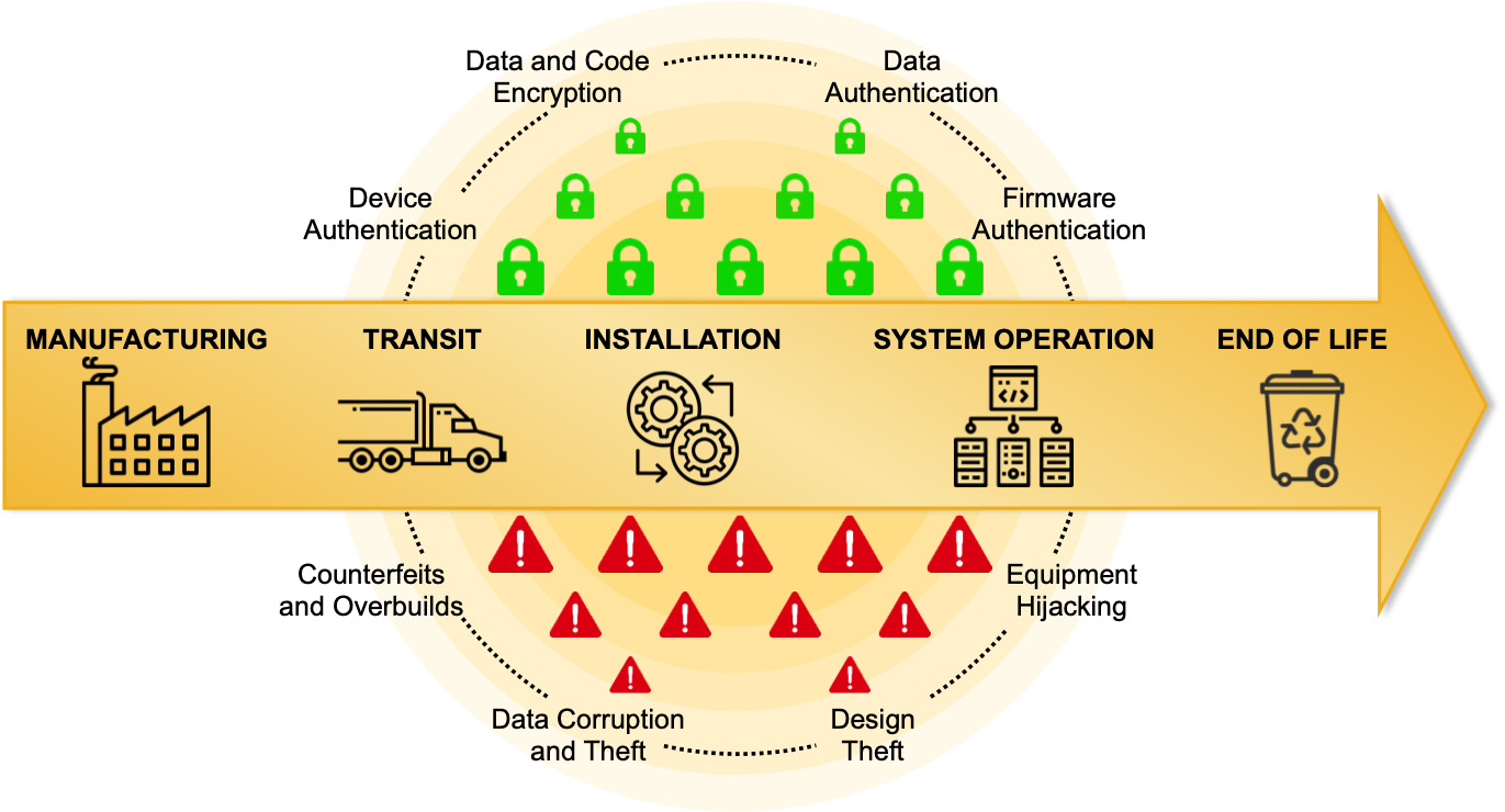 보안 기능이 없는 시스템에는 데이터와 설계의 도용, 제품 복제 및 오버빌딩(overbuilding), 디바이스 조작 또는 강탈의 우려가 늘 존재한다.