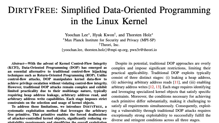 티오리는 자사 연구원이 참여한 논문 ‘DirtyFree: Simplified Data-Oriented Programming in the Linux Kernel’이 NDSS를 통해 공개됐다고 밝혔다. 이번 연구에는 독일 막스플랑크 연구진과 티오리 연구원이 공동으로 참여했다. NDSS는 정보보안 분야의 주요 학술대회 가운데 하나로 꼽힌다.