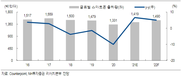 NH투자증권에 따르면 올해 스마트폰 출하량은 반도체 공급 부족 영향과 코로나19 재확산의 여향으로 전년대비 6.6% 증가한 약 14억2,000만대를 기록하며 당초 기대보다는 소폭 낮은 수준으로 전망된다.