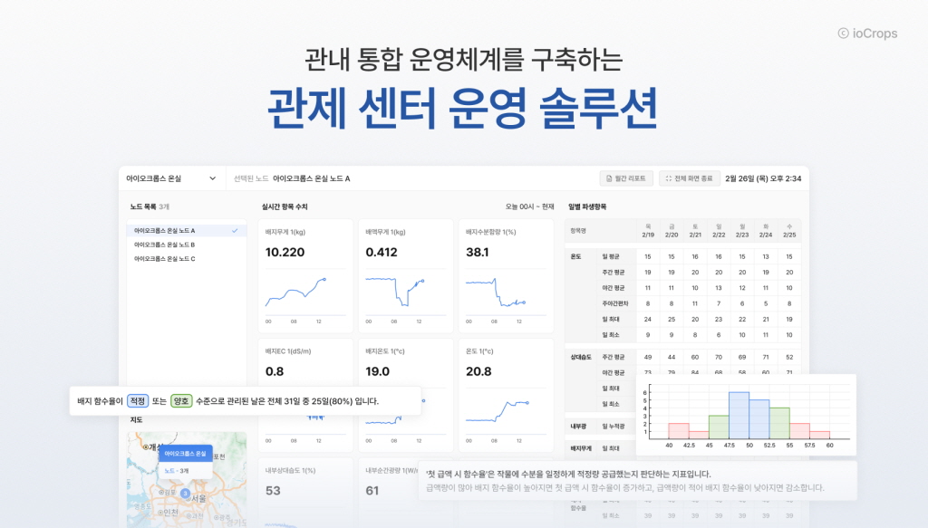 스마트팜이 개별 농가의 기술 도입을 넘어 지역 단위 관리 체계로 진화하는 가운데, 아이오크롭스의 관제센터 운영 솔루션이 지자체 스마트농업의 새로운 기준으로 떠오르고 있다.