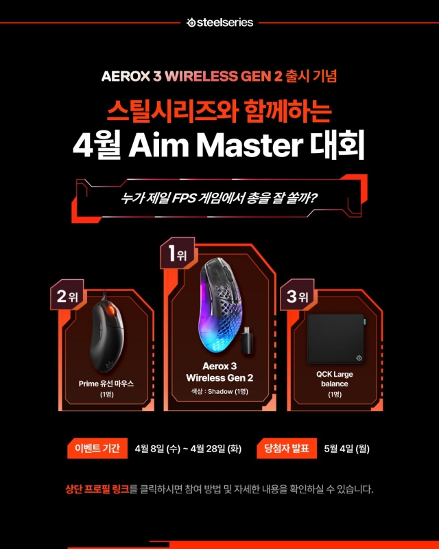 스틸시리즈는 13일 ‘에어록스 3 무선 Gen 2’ 출시를 기념해 ‘스틸시리즈와 함께하는 4월 에임 마스터 대회’를 진행한다고 밝혔다. 행사는 4월 8일부터 28일까지 피씨디렉트가 운영하는 네이버 스마트스토어를 통해 진행되며, 이벤트 페이지 방문자는 누구나 참여할 수 있다.