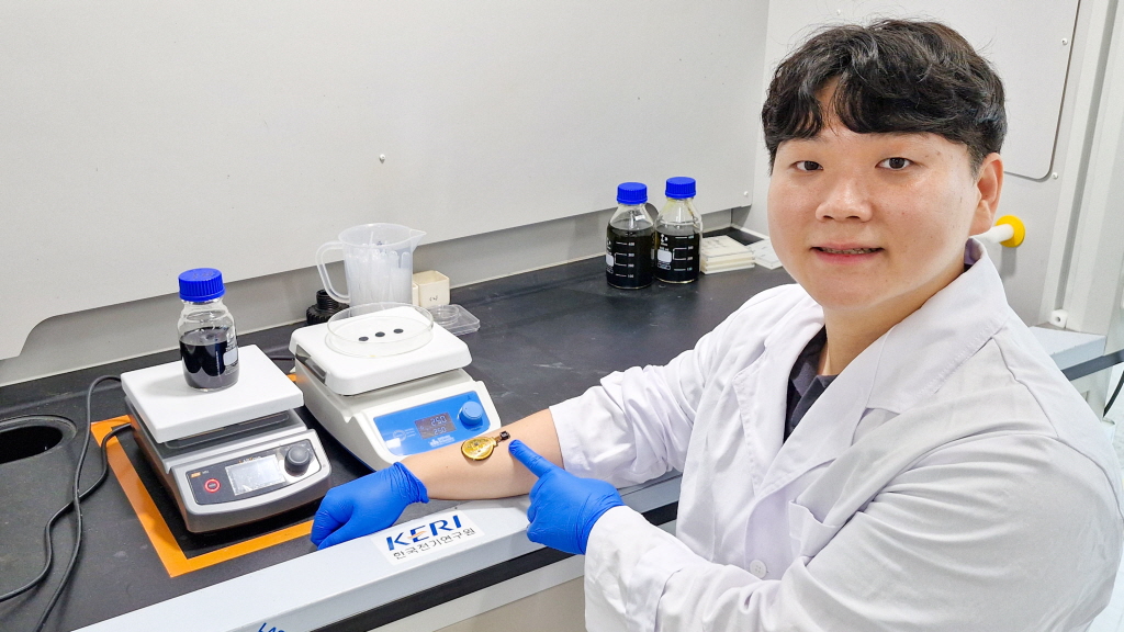 ▲KERI 최명우 박사가 ‘다기능 무선 생체 센서’를 부착하고 포즈를 취하고 있다.